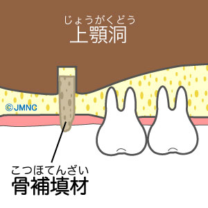 インプラントを埋め込むために開けた穴から、直接サイナスに骨補填材を入れ込んんで骨量を増やします。比較的骨不足が深刻でない方向けの治療法です。