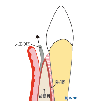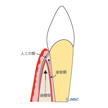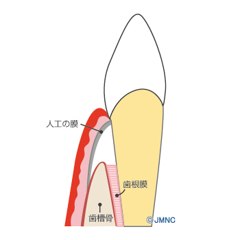 「GBR(Guided Bone Regeneration)」は、歯茎の下の骨が足りていない隙間に、人工的な骨補填材を詰める治療法です。補填した部分をメンブレンと呼ばれる特殊な人工膜で覆って保護します。これらが骨の再生を促しつつ、やがて体内に吸収されながら骨と置き換わるようにできています。