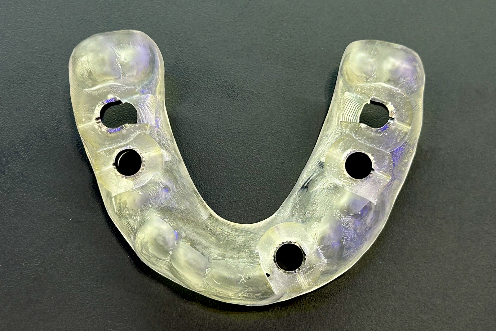 シミュレーションソフトで導き出したデータをもとに、「サージカルガイド」を製作します。サージカルガイドは、要所に穴が開いているマウスピース型の手術補助装置です。