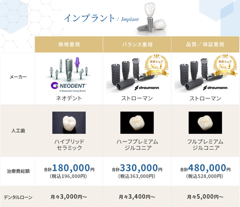 当院のインプラントは患者さんのご要望に合わせ3パターンの料金体系があります。どれも世界的に評価されているインプラントメーカーになります。また、通常はCT撮影や診断を行う場合、費用が掛かりますが。当院では治療に入る前までは一切費用は掛かりません。つまり、相談+CT撮影+診断は0円になります。