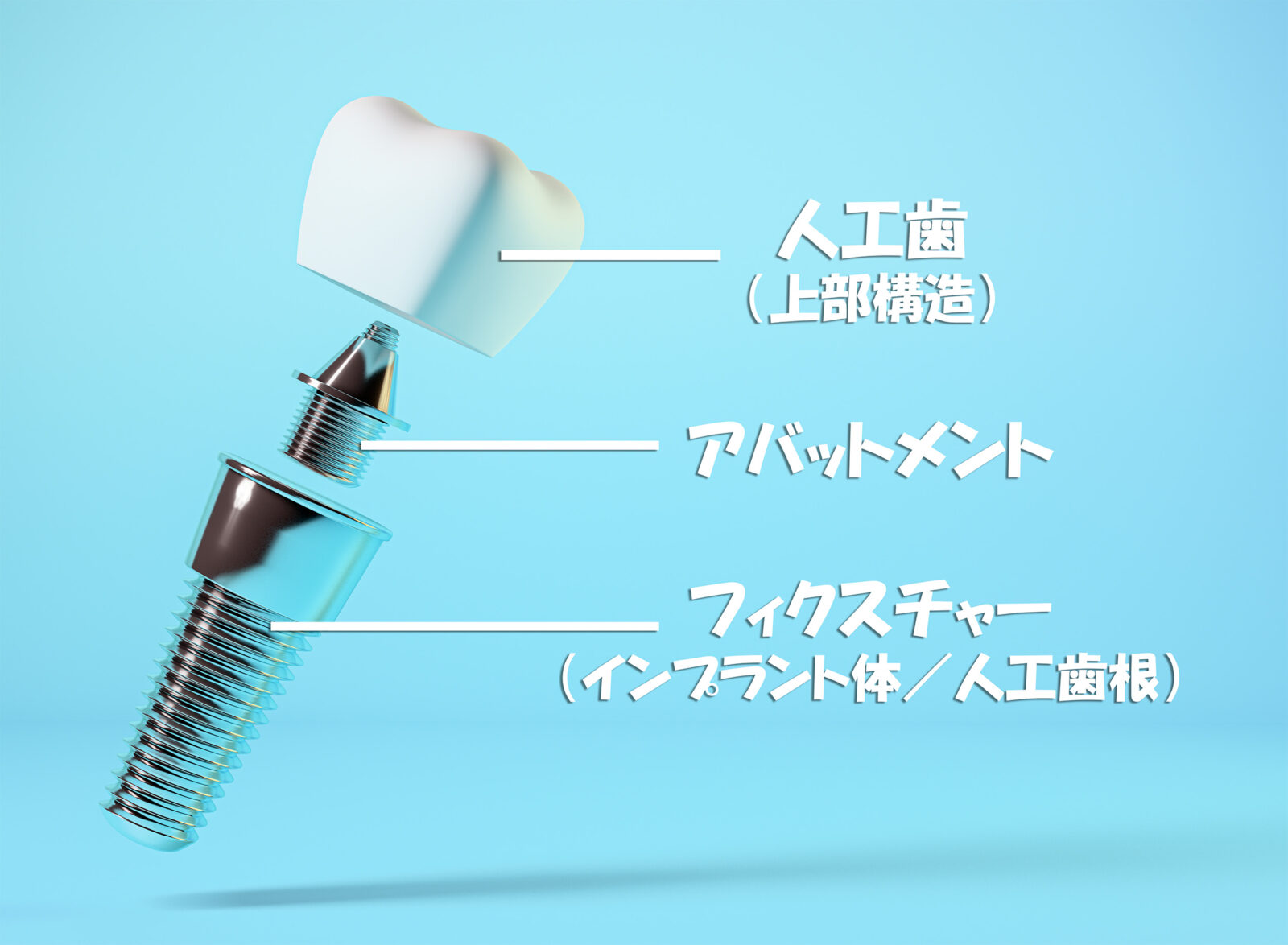 インプラントは、あごの骨に金属の支柱を埋め込み、その上に人工の歯(上部構造)を取り付ける治療です。本来の歯と同じように一本一本が独立して固定されて、骨と結合しているため、グラつく心配も少なく噛み心地も自然です。