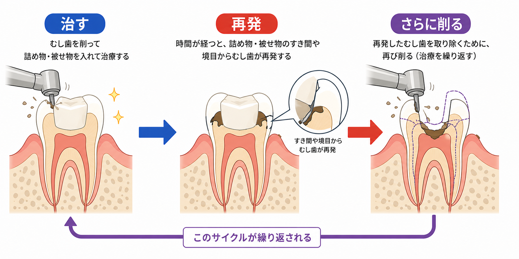 しかし、その背景には、材料や治療方法の制限、歯が少しずつ削られていく仕組み、そして再発しやすい構造といった要因が関係しています。